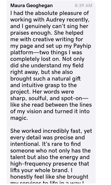 My services are vast from, writing services, marketing copy writer, website design and or creative all energetically intuitively tailored to your Spiritual gifts and talents.